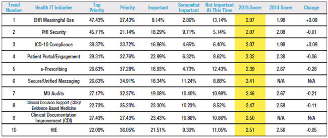 Congdon reveals that this year there was a three-way tie for top health IT trend for 2015 among EHR MU (electronic health records meaningful use), PHI (protected health information) Security, and ICD-10 Compliance. By diving deeper into the data to determine the tiebreaker (percentage of survey respondents who ranked each of these initiatives as a “Top Priority”), final rankings were determined. “Nearly 50 percent of our survey respondents [47.43 percent] ranked EHR MU a ‘Top Priority’ for 2015, making it our top overall health IT trend for the fifth year in a row,” says Congdon. “This initiative was followed by PHI Security, which received ‘Top